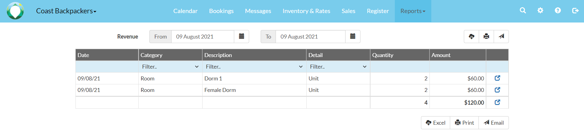 The "Revenue Listing" report allows you to show all made revenue to a certain period of time.