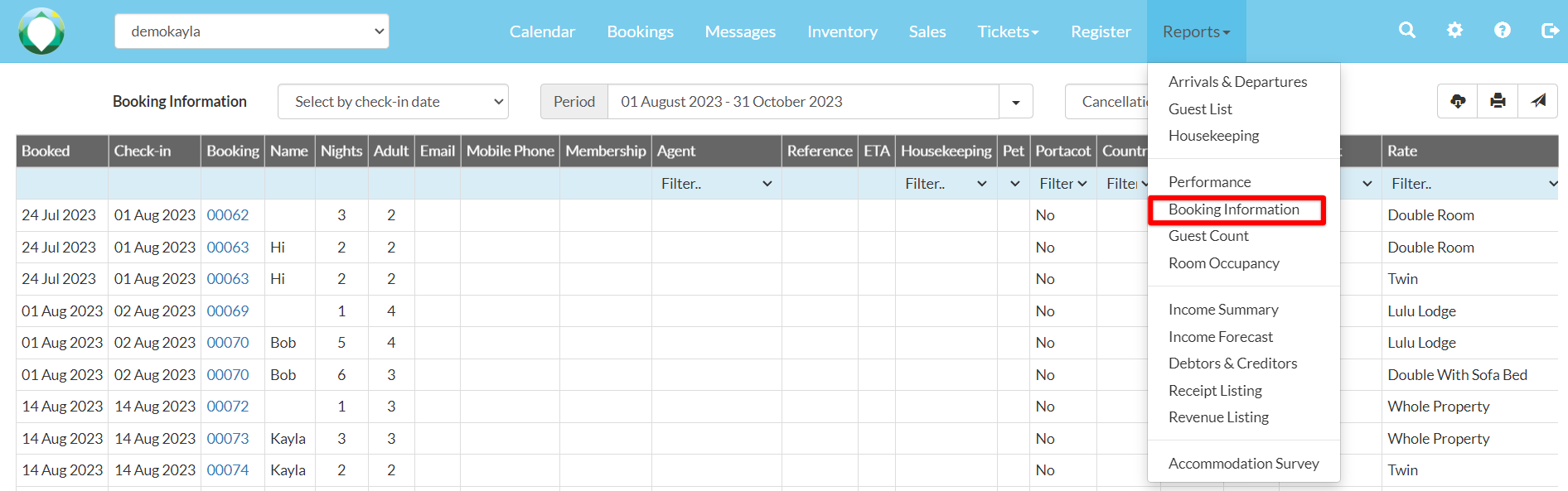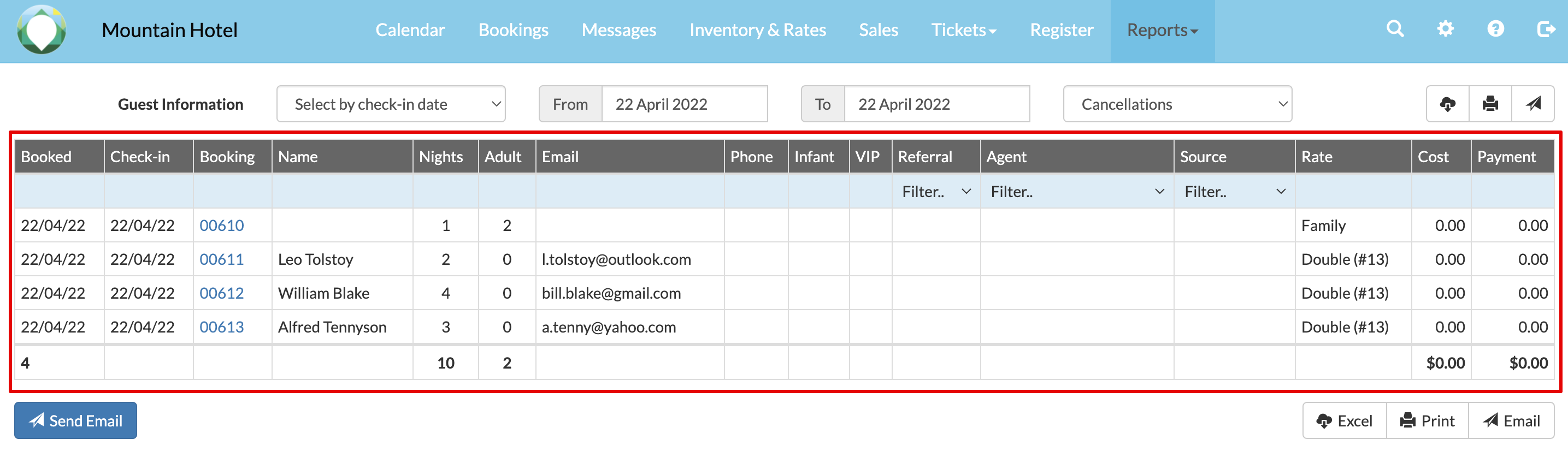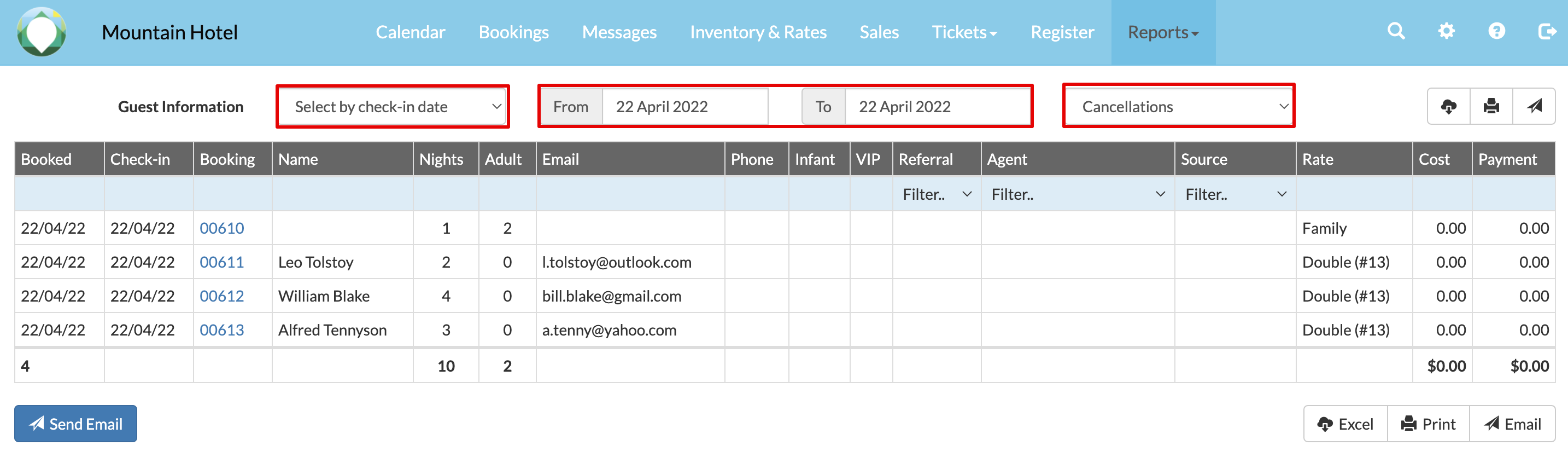 - Select by check-in date or booking date, the date range and toggle to Cancellations.